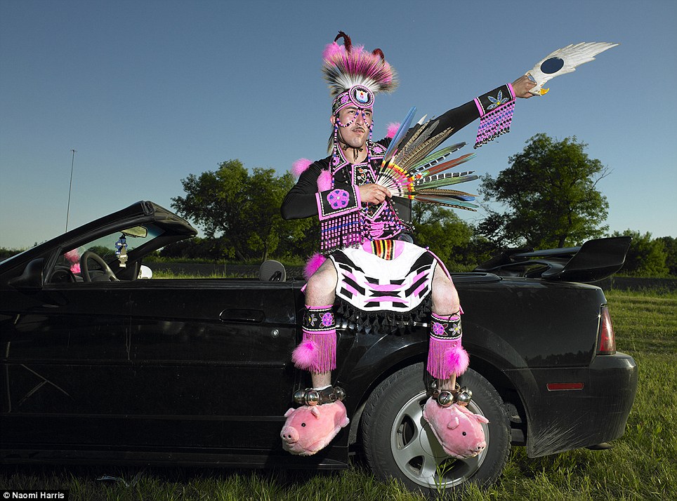 A Sioux Indian in an unusual attire complete with pink pig-shaped slippers attends a Valley Pow Wow in Sioux Valley, Manitoba