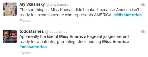 A few just sighed and wondered why the winner wasn’t Miss Kansas, Theresa Vail. Miss Kansas won fans early on because of her military background, and for being the first Miss America contestant to bare her tattoos. Amazing. (I’m being sarcastic about the tattoos.)
