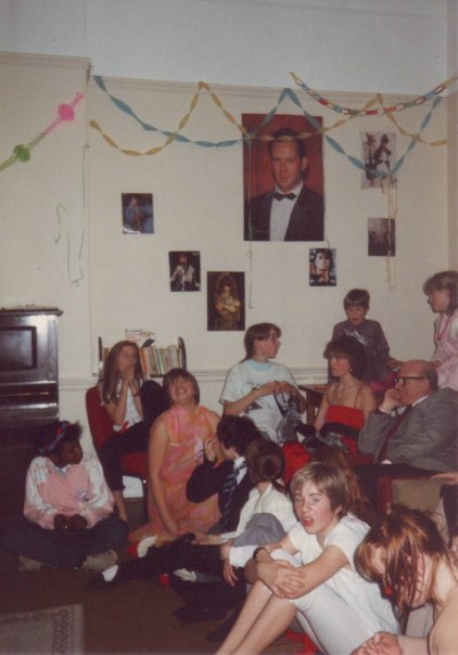 British school girls in a boarding school common room (can you spot me?!). Note Bruce Willis on the wall!